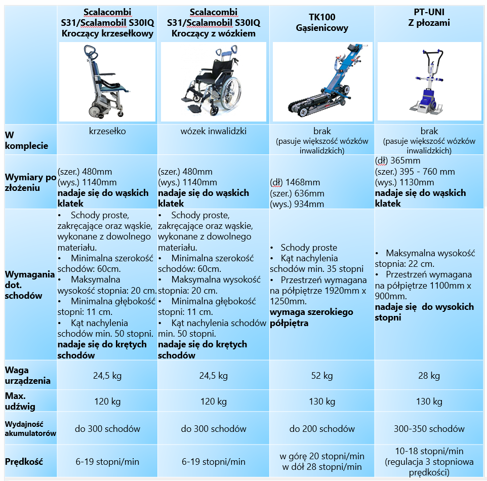 Rozważając zakup bądź wynajem schodołaza warto jest porównać podstawowe parametry urządzeń.